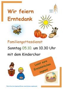 Den nächsten Kinder- und Familiengottesdienst feiern am 5. Oktober um 10.30 Uhr zu Erntedank! Bringt gerne ein Erntekörbchen mit euren Lieblingsfrüchten mit, um es segnen zu lassen.