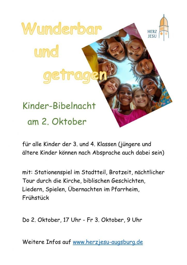 mit: Stationenspiel im Stadtteil, Brotzeit, nächtlicher Tour durch die Kirche, biblischen Geschichten, Liedern, Spielen, Übernachten im Pfarrheim, Frühstück