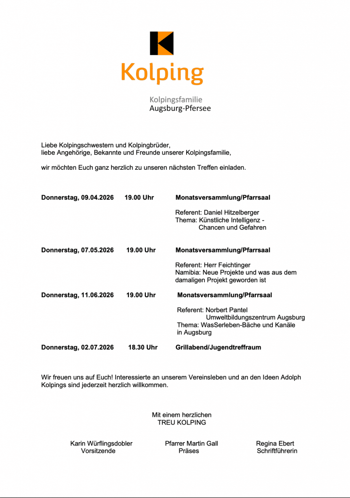 Innerhalb des Kolpingwerkes Deutschland ist die Kolpingsfamilie Augsburg-Pfersee eine familienhafte und generationsübergreifende Gemeinschaft, in der sich Christinnen und Christen engagieren. Sie ist offen für alle Menschen, die auf der Grundlage des Evangeliums und der katholischen Soziallehre/christlichen Gesellschaftslehre Verantwortung übernehmen wollen. Wir verstehen uns als Weg-, Glaubens-, Bildungs- und Aktionsgemeinschaft. Mit unseren Themen aus allen Lebensbereichen versuchen wir, die Ideen Adolph Kolpings umzusetzen! Jeder ist herzlich willkommen!
