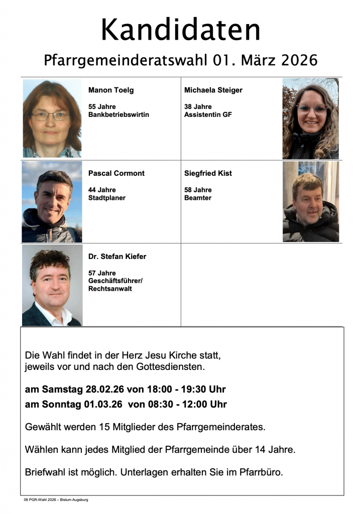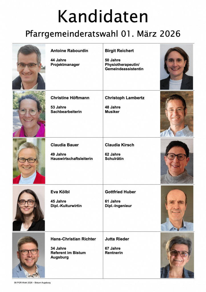 PGR Wahl am Sonntag, den 01.03.2026 Von Peter Franken|Februar 11th, 2026|Allgemein|Kommentare deaktiviert für PGR Wahl am Sonntag, den 01.03.2026 Teile diesen Beitrag! FacebookXRedditLinkedInTumblrPinterestVkE-Mail Über den Autor: Peter Franken Ähnliche Beiträge Samstag, 14.03.26, 19.30 Uhr: Indisches Fastenessen im Pfarrheim Samstag, 14.03.26, 19.30 Uhr: Indisches Fastenessen im Pfarrheim Pfarreiwallfahrt nach Frankreich 24.-31.05.26 (Anmeldung bis zum 06.03.) Pfarreiwallfahrt nach Frankreich 24.-31.05.26 (Anmeldung bis zum 06.03.) Wechsel im Pfarrbüro Wechsel im Pfarrbüro 22.02.26, 15.00 Uhr, Kreuzwegandacht im Exerzitienhaus Leitershofen 22.02.26, 15.00 Uhr, Kreuzwegandacht im Exerzitienhaus Leitershofen Vorsorgevollmacht, Betreuungsverfügung, Patientenverfügung- Vortrag 10.02.26 Vorsorgevollmacht, Betreuungsverfügung, Patientenverfügung- Vortrag 10.02.26