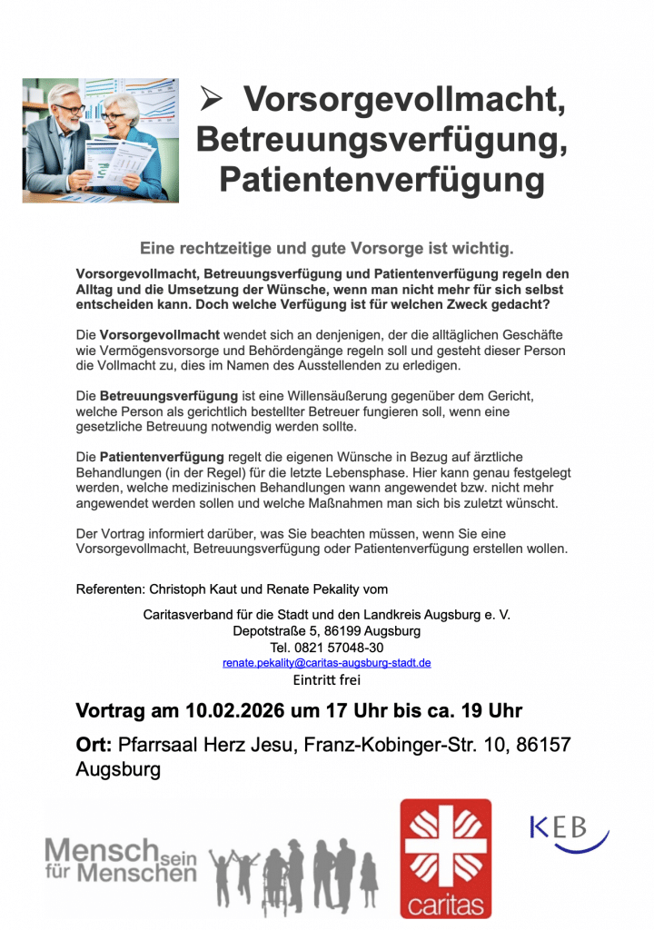 Vorsorgevollmacht, Betreuungsverfügung, Patientenverfügung- Vortrag 10.02.26 Von Peter Franken|Januar 20th, 2026|Allgemein|Kommentare deaktiviert für Vorsorgevollmacht, Betreuungsverfügung, Patientenverfügung- Vortrag 10.02.26 Teile diesen Beitrag! FacebookXRedditLinkedInTumblrPinterestVkE-Mail Über den Autor: Peter Franken Ähnliche Beiträge Pfarreiwallfahrt nach Frankreich 24.-31.05.26 Pfarreiwallfahrt nach Frankreich 24.-31.05.26 ‚Hoffnung, die uns trägt‘. Ökumenischer Gottesdienst am Mittwoch, 14.01.2026 ‚Hoffnung, die uns trägt‘. Ökumenischer Gottesdienst am Mittwoch, 14.01.2026 Ankündigung Neujahrskonzert Ankündigung Neujahrskonzert Schließzeiten Pfarrbüro und Bücherei in den Weihnachtsferien Schließzeiten Pfarrbüro und Bücherei in den Weihnachtsferien Verabschiedung Evelyn Lanzinger Verabschiedung Evelyn Lanzinger