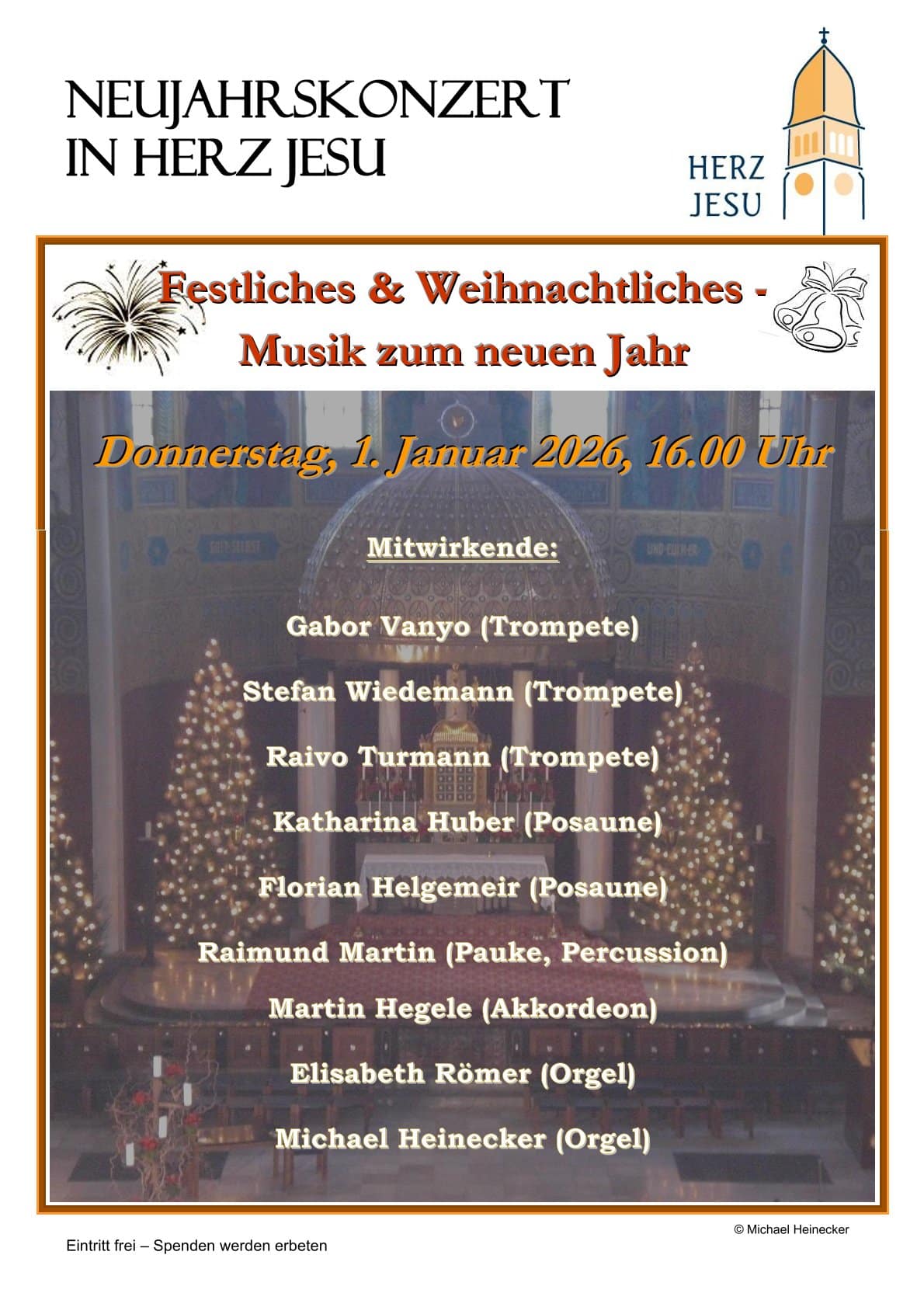 17.00 Uhr Festgottesdienst zum Jahresschluss, Gestaltung: Kirchenchor Herz Jesu, festliche Musik für Trompeten, Pauken und Orgel